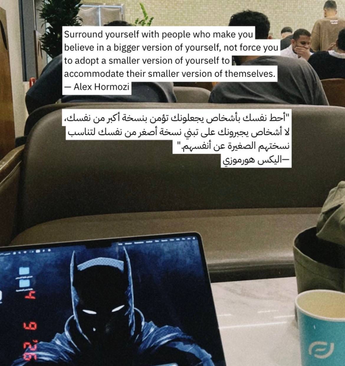 “أحِط نفسك بأشخاص يجعلونك تؤمن بنسخة أكبر من نفسك، لا أشخاص يجبرونك على تبنّي نسخة أصغر من نفسك لتناسب نسختهم الصغيرة عن أنفسهم.” — أليكس هرموزي